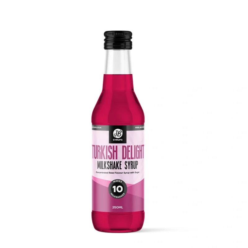Travel to far-off lands with our Turkish Delight (Rose) milkshake syrup by JB Syrups. Its fragrant rose flavour and exotic flair make every sip a little journey to Turkey. A delightful escape in a bottle!